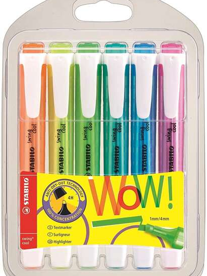 Stabilo Swing Cool Pack de 6 Marcadores Fluorescentes - Cuerpo Plano - Punta Biselada - Trazo entre 1 y 4mm - Tinta con Base de Agua - Antisecado - Co