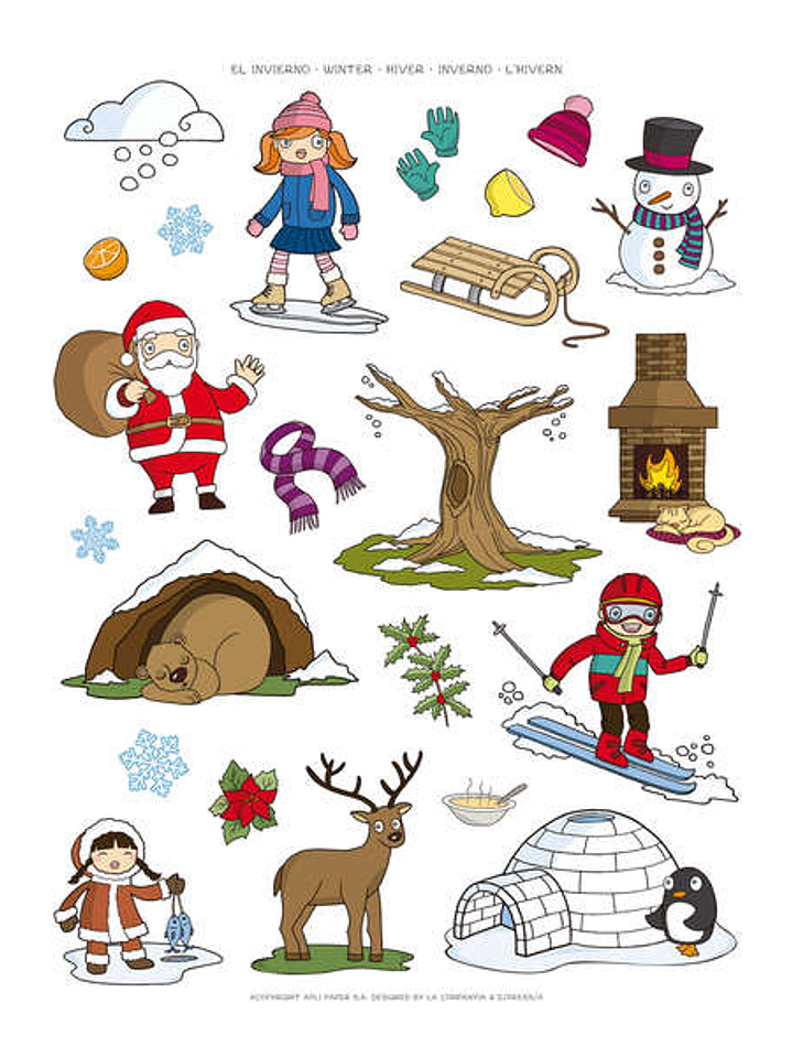 - Desarrollados con la colaboración de educadores para ayudar a los niños a identificar conceptos, objetos y animales asociados a la estación del invierno.